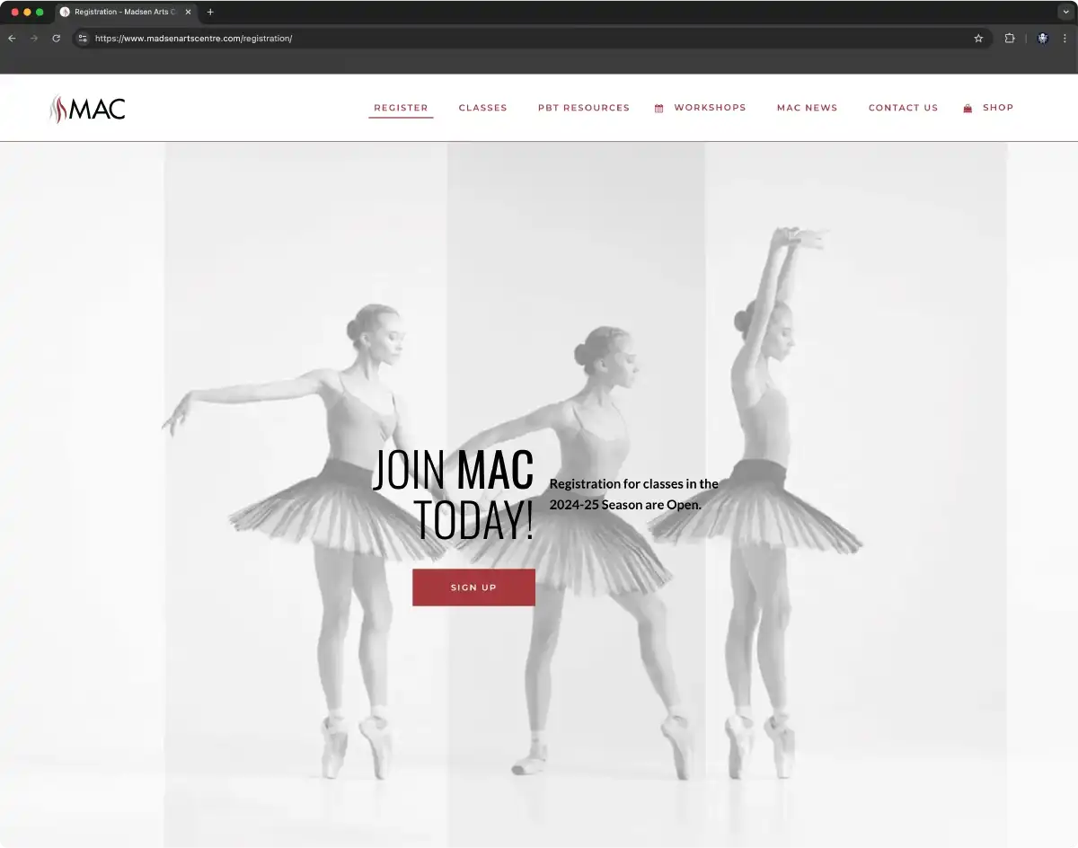 The strength and elegance of ballet underpins everything on the MAC website, echoing the discipline required of students and their instructors.